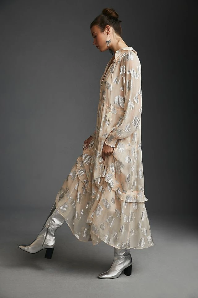 Meet the Marais Maxi Dress, one of our bestselling dresses, ever, updated with delicate metallic flowers. A vision of feminine romance and sophisticated ease, ruffled tiers fall gracefully from the effortless waistline, swaying gently as you walk, with a breezy sleeve and open v-neckline.
