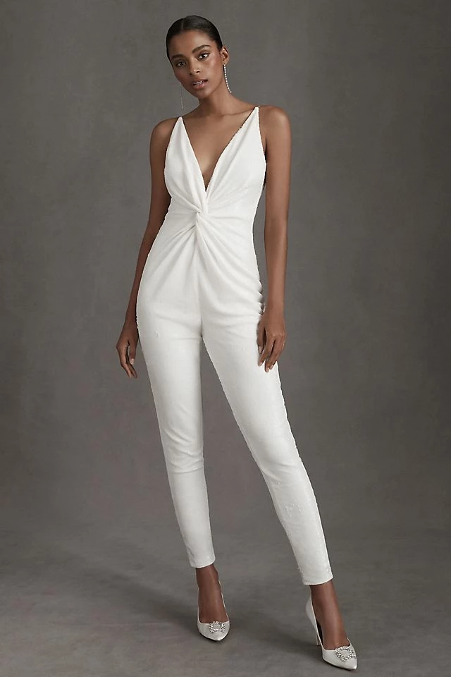 This dazzling jumpsuit from Halston is elegant simplicity at its finest. Delicate straps, a plunging neckline, and a low-cut open back add allure to this vintage-inspired (yet totally modern) approach to wedding-celebration attire.