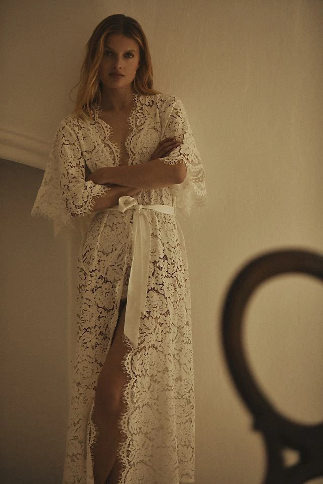 Lace-lined and tied with a silky sash, this romantic robe features delicate flowy sleeves and scalloped trim.